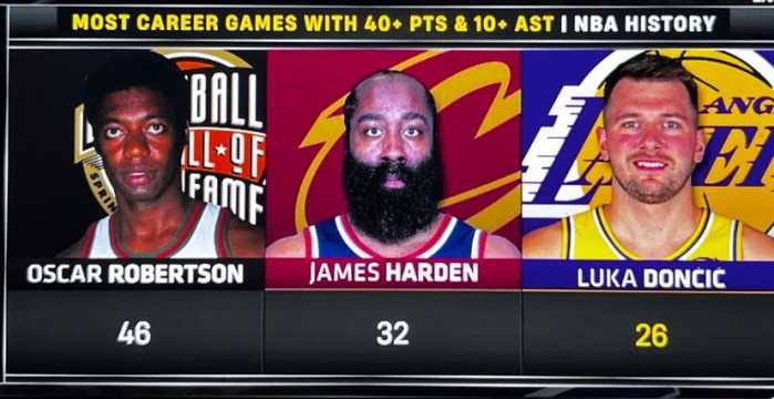 东契奇砍生涯第26次至少40分10助&历史第三多 与第二的哈登差6次